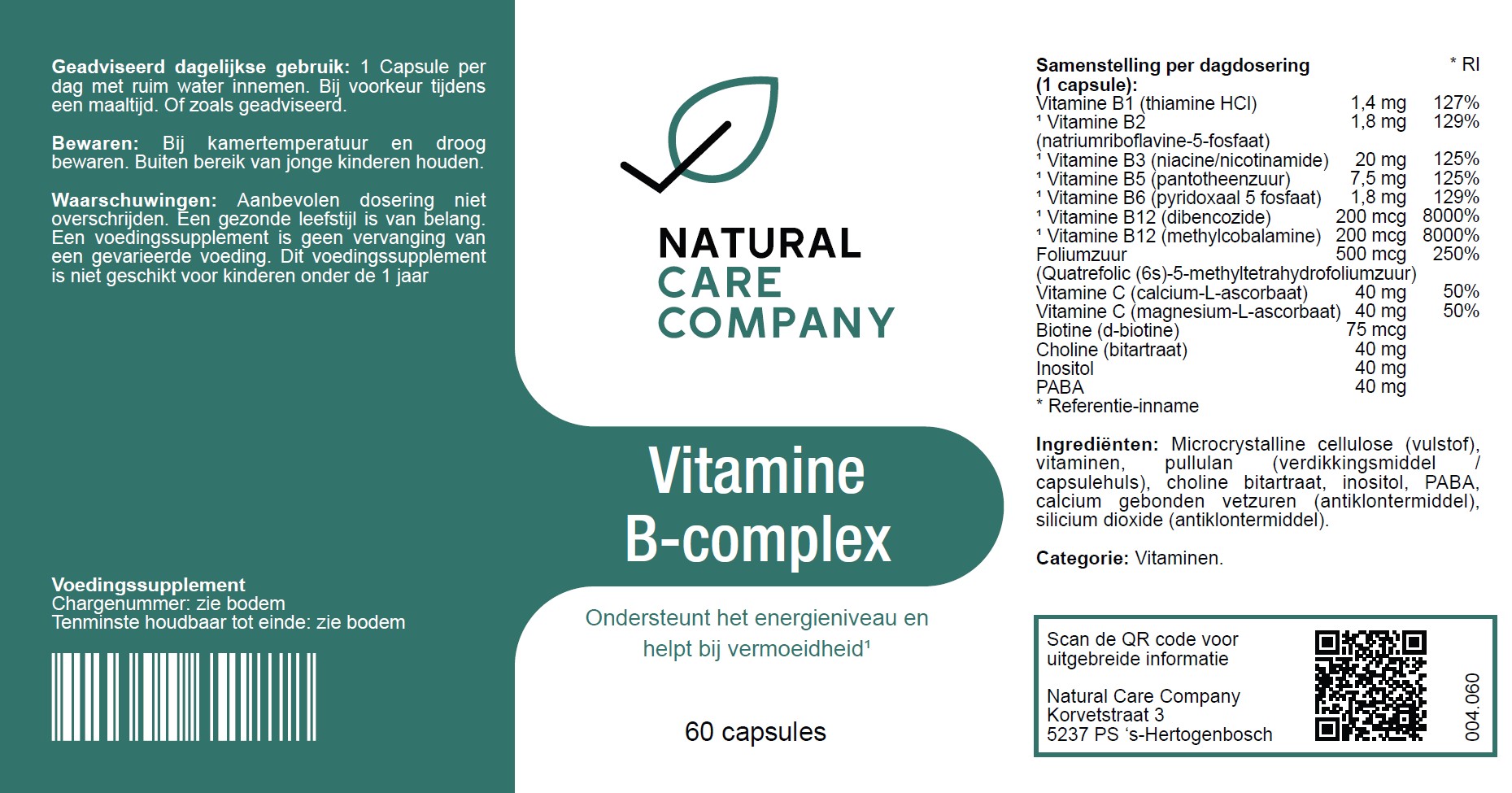 Ons vitamine B-complex bevat de hoogst opneembare vormen van de verschillende B-vitaminen in combinatie met de halfvitaminen (PABA, Choline en Inositol) en gebufferde vitamine C.